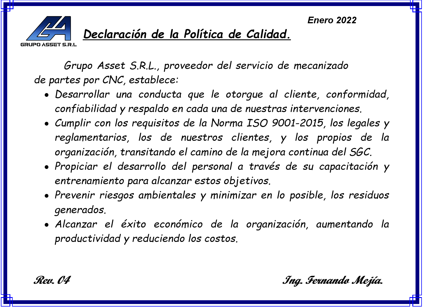 Dentro del Grupo Asset, realizamos funciones y actividades encaminadas a construir la calidad, en comunión con nuestros clientes, tratando en todo momento de conocer y entender sus necesidades, para poder lograr cumplir con su satisfacción y expectativa.
